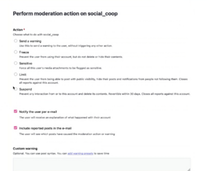 Custom actions for members of other servers are only: Sensitive, Limit, and Suspend. As social.coop does not have access to other users emails we cannot email them about the action.